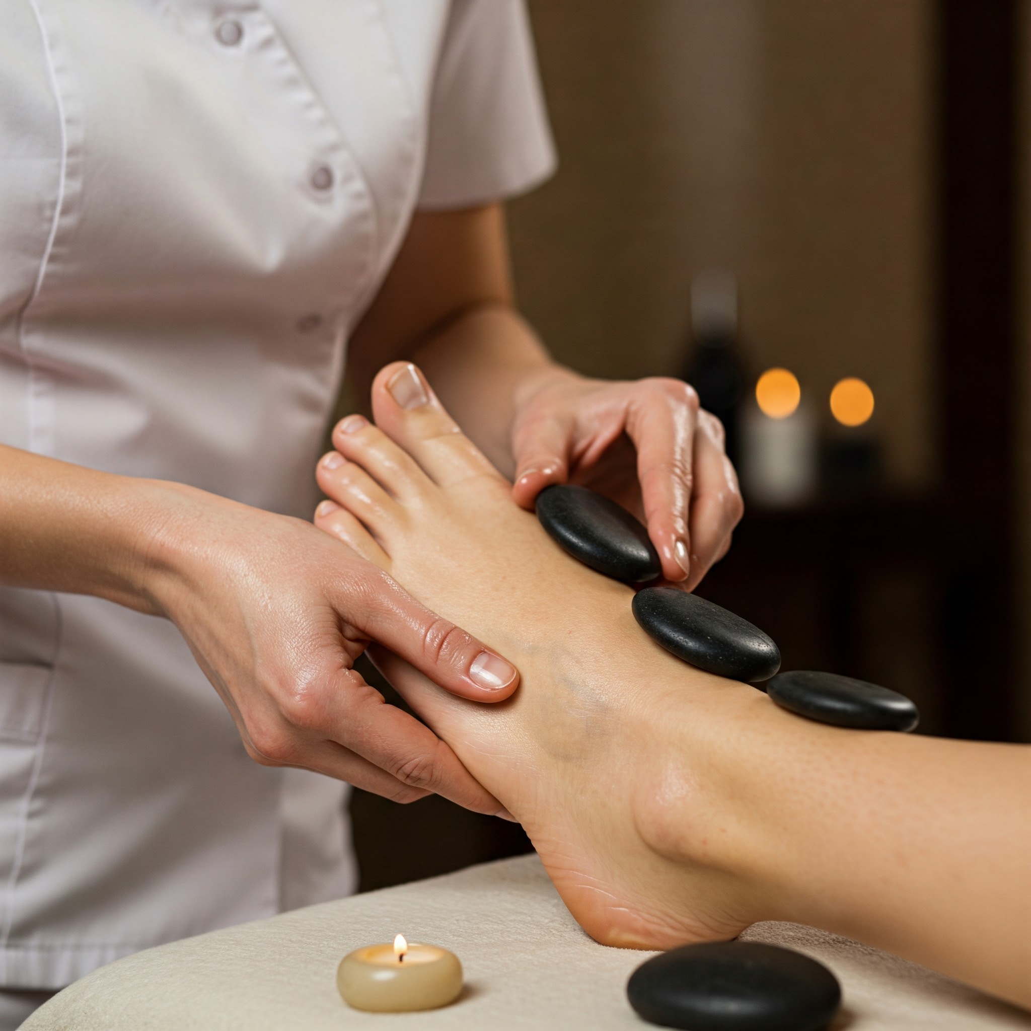 Unwind as the soothing warmth of hot stones complements a relaxing foot massage for ultimate comfort.